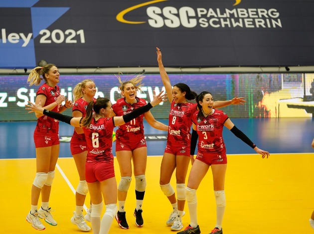 Tonight, in the last round, Italy’s Unet e-work Busto Arsizio swept Pool A hosts SSC Palmberg Schwerin by a 3-0 (25-20, 25-13, 25-12). With the win over the German side, to which they were led by Canadian Alexa Gray (17 points) and Rossella Olivotto (4 blocks), ’The Butterflies’ didn’t have to wait for other results this evening and managed to progress to the quarterfinals as one of the three best runners-up across all pools (3rd best runner-up).