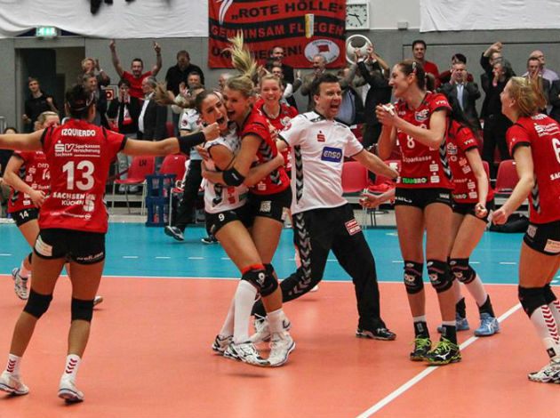 DRESDNER SC won their first match on Tuesday night 3:2 as if by a miracle. This seems to be a sensation as the team of the Russian legend Nikolai Karpol did not lose any home match in 2014 CEV Volleyball Cup in this season.