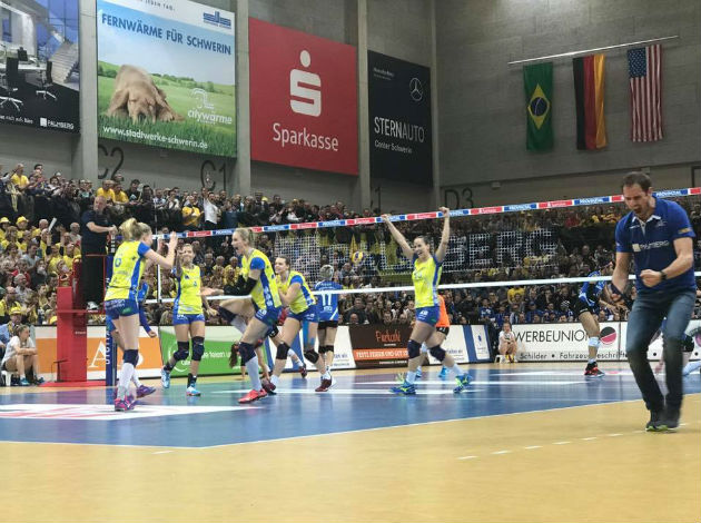 Top seed Schwerin achieved a brutal victory over No.2 Allianz MTV Stuttgart in Game 3 to complete a sweep in the playoff finals 3-0 (25-17, 25-14, 25-16). Thus, the team coached by Felix Koslowski claimed its first championship title in four years on a superior way, without losing a single game in the playoffs (2-0 in quarterfinals, 2-0 in semifinals and 3-0 in finals) and dropping only four sets during its „rampage“.