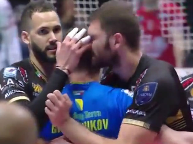 While going for a group hug after winning the point, Osmany Juantorena accidentally put his finger in Sokolov’s eye…