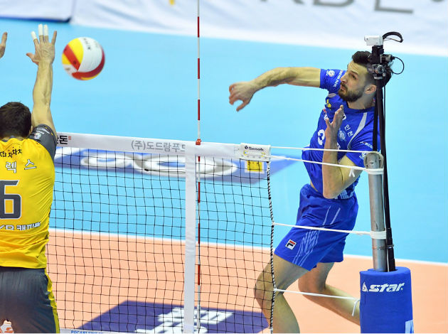 The Jumbos defeated Uijeongbu KB Insurance Stars by a 3-2 (20-25, 25-29, 25-21, 21-25, 15-9) to go around them in the V-League rankings and settle at the place No.3. Both sides have an 8-7 record but with the Jumbos having one point more than KB Stars – 24 points. The Slovenian opposite Mitja Gasparini scored 33 points for the winners to tie with the Hungarian Krisztián Pádár from Seoul Woori Card Wibee at the top of the tournament’s top scorer’s list with 384 points. The Portuguese international Alexandre Ferreira made 32 points for KB Stars.