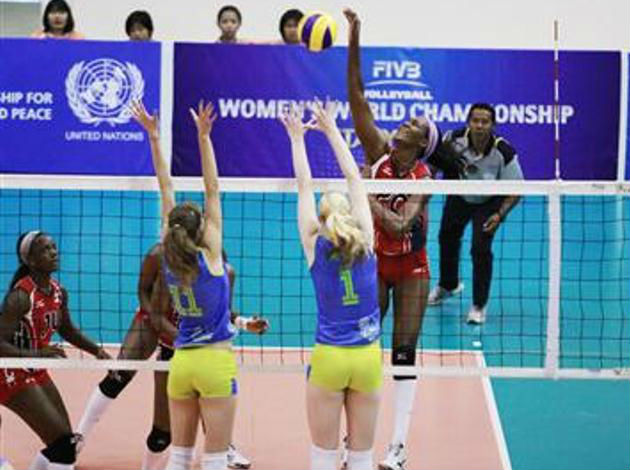 Elizabet Martinez (Dominican) spiking against Slovenia double block