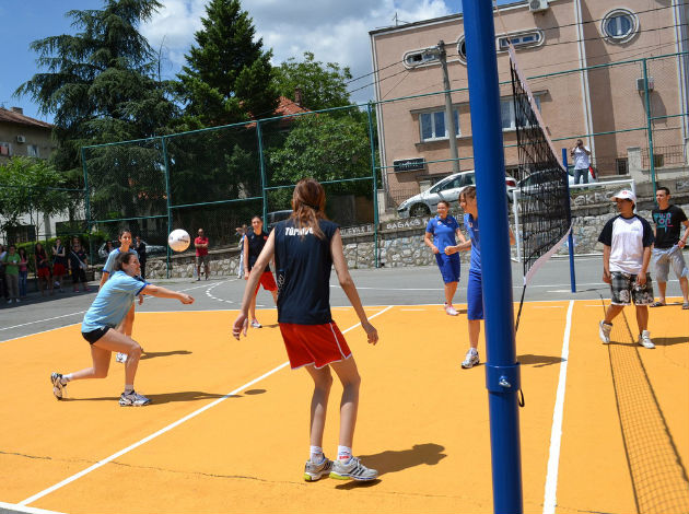 The four teams helped paint the end of the volleyball field and then played a match with the local children.