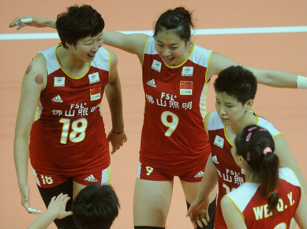 China coach Juemin Yu and his team after an exciting match lost against Thailand with 2:3 (25:21, 22:25, 32:34, 25:21, 15:13)