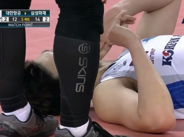 Kim Hyeong-Woo, the middle blocker of Korean Air Jumbos, landed on the setter of his team Han Sun-Soo during a rally.