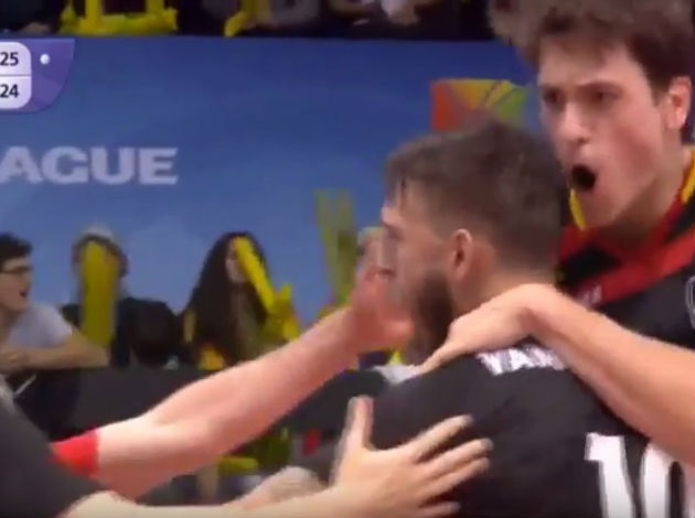 On a set ball in the second set, French middle blocker Nicolas Le Goff jumped for a quick attack to equalize at 25-25, but his colleague on the other side, Simon van de Voorde, saw through him and set a BRICK WALL on the net!