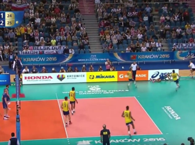 But, that’s not all. Right afterwards, Bruno Rezende switched the ball over the net by doing an overhead bump shot from a commercial panel!