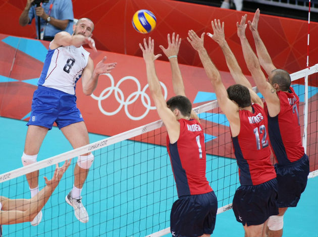 Russia took a narrow lead in the first set, with Taras Khtey and Maxim Mikhaylov doing most damage. Russian errors and Clayton Stanley spikes and blocks accounted for USA‘s points as they caught up, and the score tied at 24-24. Russia saved three set points before a Matthew Anderson‘s ace gave USA the set 29-27.